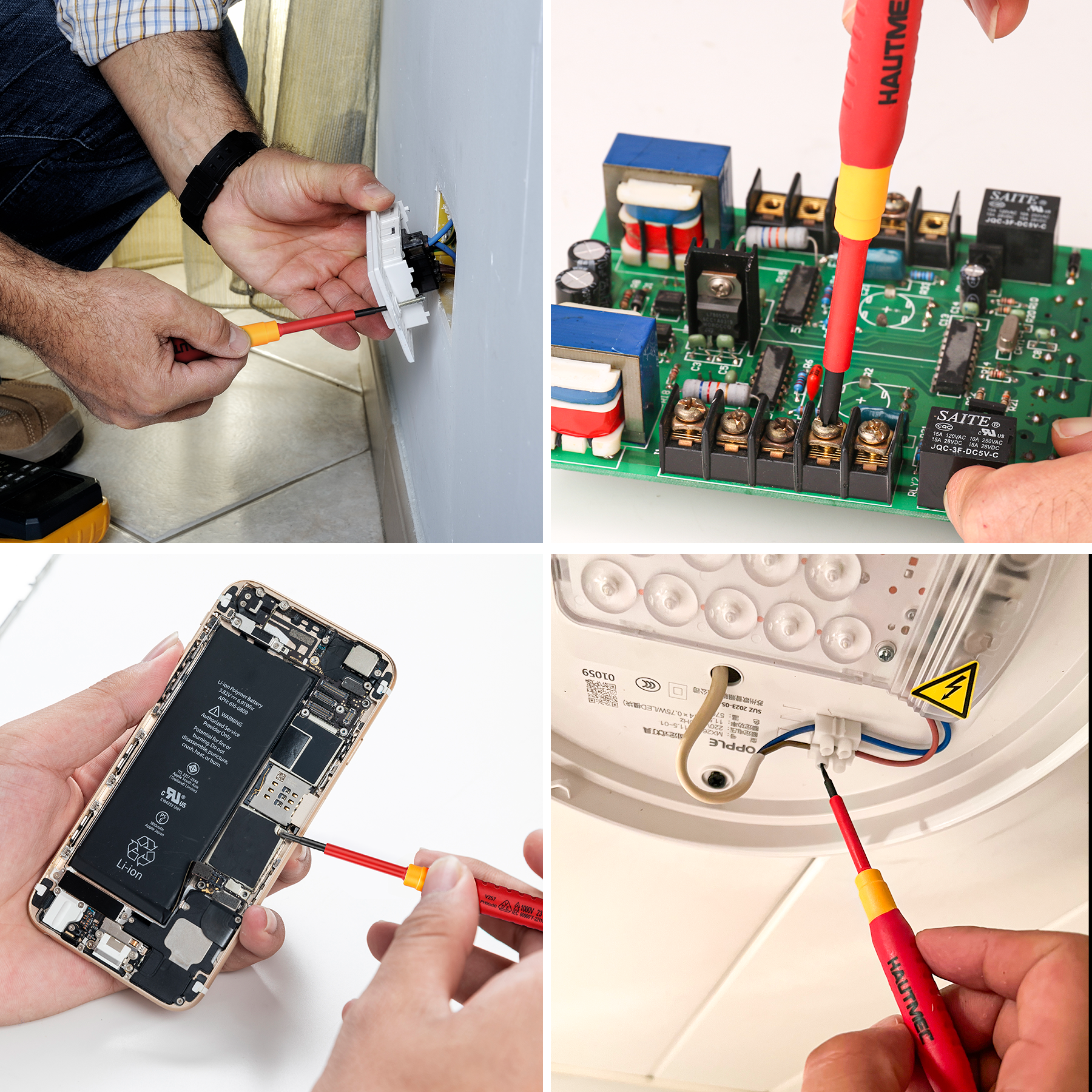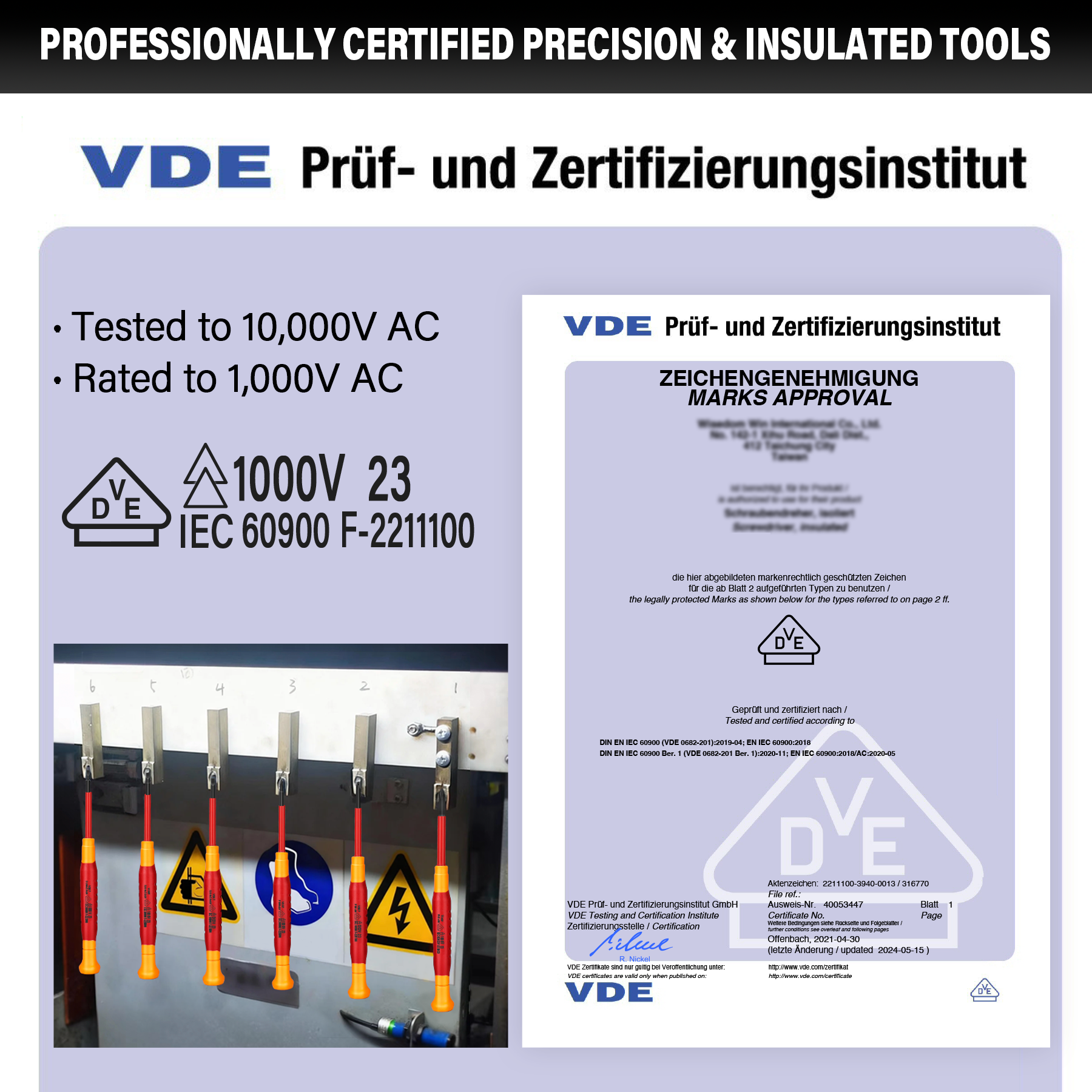 - [Professionally VDE Certified]: Each electrician screwdriver set is VDE certified and 100% tested to 10,000V, with a 1000V AC/DC rating to help prevent short circuits and protect sensitive components. Designed for safe use on live circuits of small appliances and PCBs.