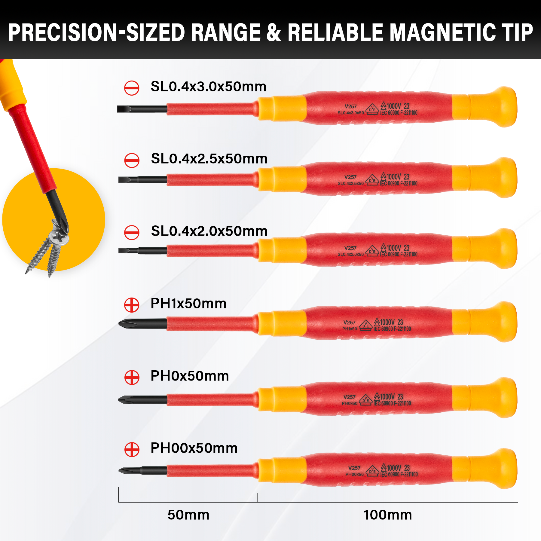 - [6-Precision-Size Complete Kit]: Covers 95% of precision electrical tasks: including PH00, PH0, PH1, SL0.4x2.0, SL0.4x2.5, and SL0.5x3.0. The PH00 and SL0.4 tips are ideal for modern compact devices, making this electrical screwdriver set well-suited for any serious technician.