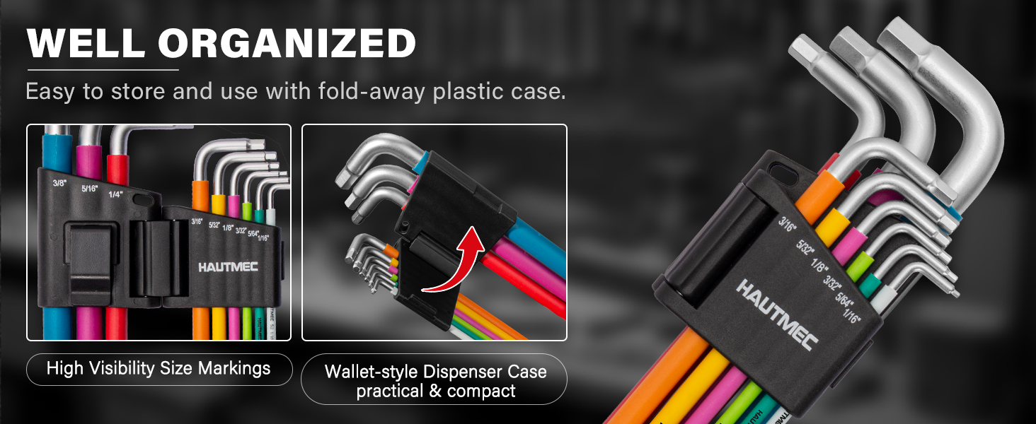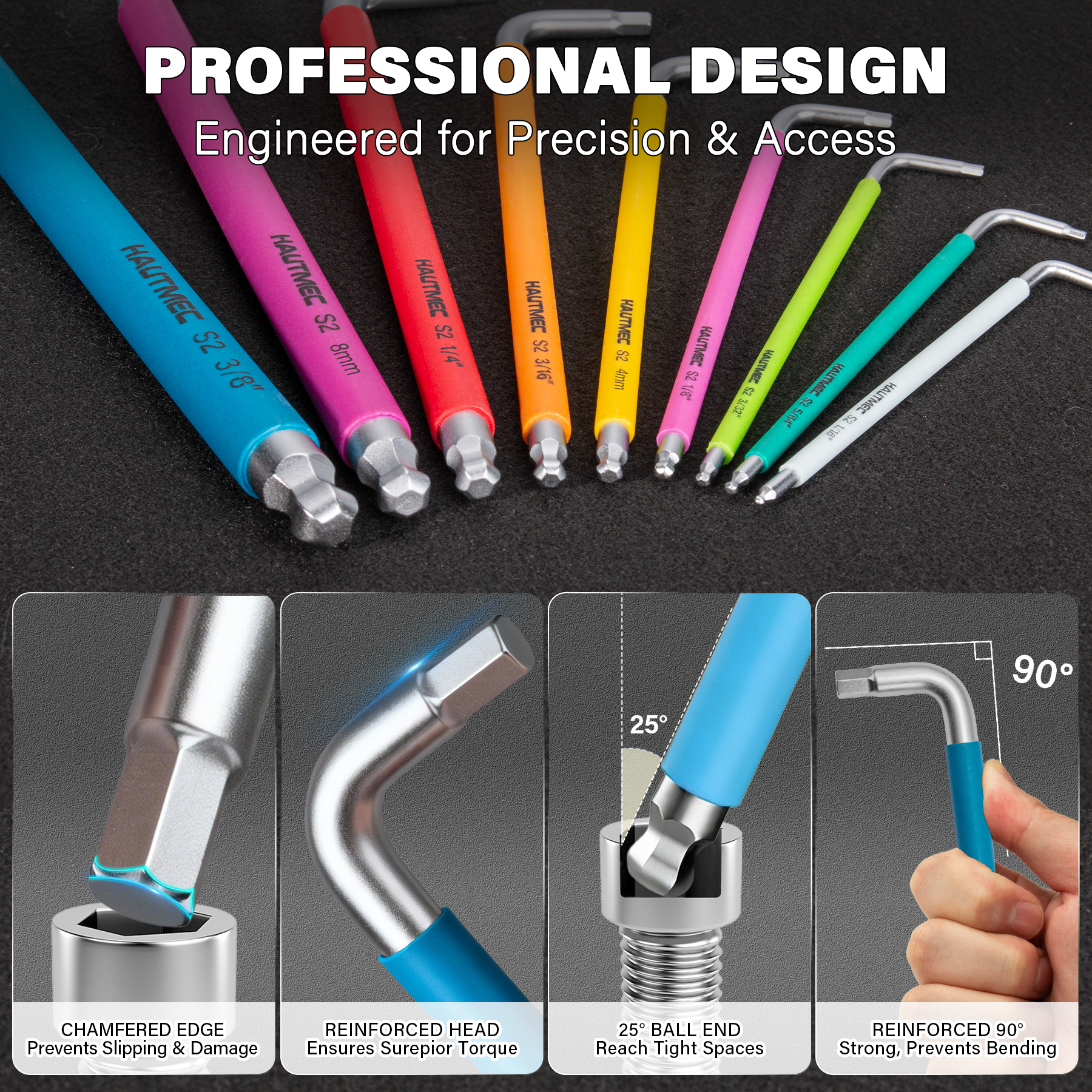 HAUTMEC Allen Wrenches Sets with Ball End, 9PCS Extra Long Arm Hex Key Set, Heavy-Duty S2 Steel Pro Allen Key Set, 1/16" to 3/8", Color Coded Sleeve with Belt Loop Pouch for Professional Mechanics HTHKP25055