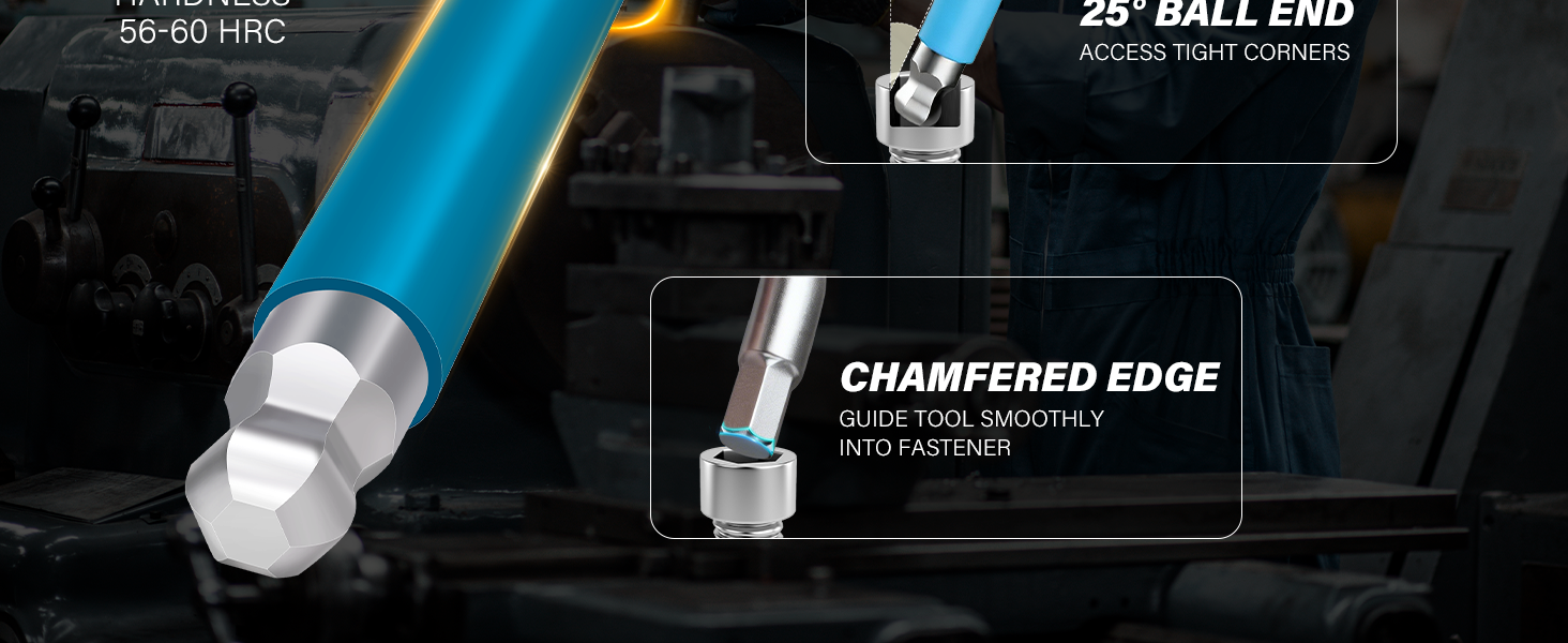 ● [Ball End & Standard Hex Design]: This ball end allen wrench set is engineered for versatility. One end features a ball head for 25° angled access to tight spaces, while the other is a standard hex with a chamfered edge for smooth engagement and full, direct torque application.