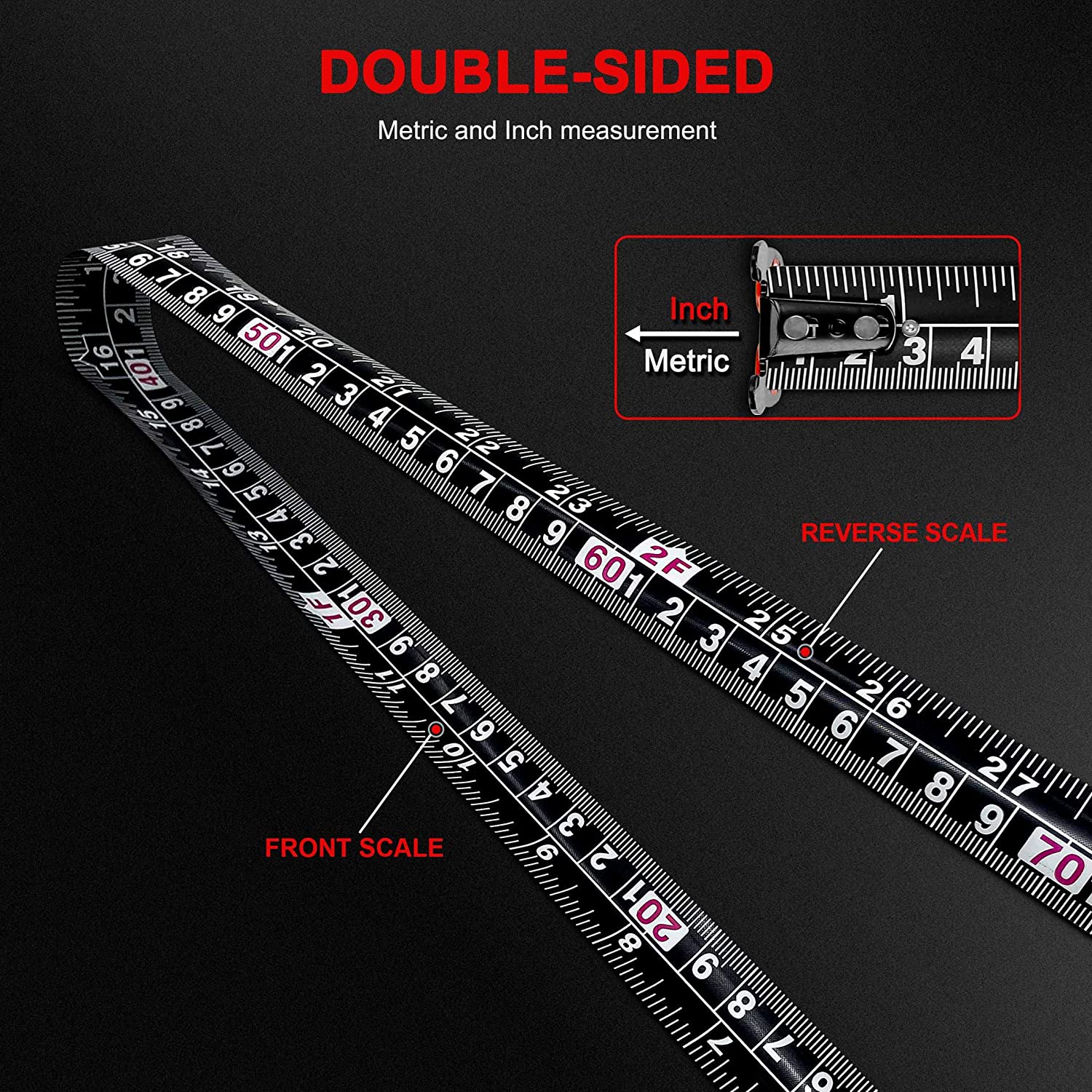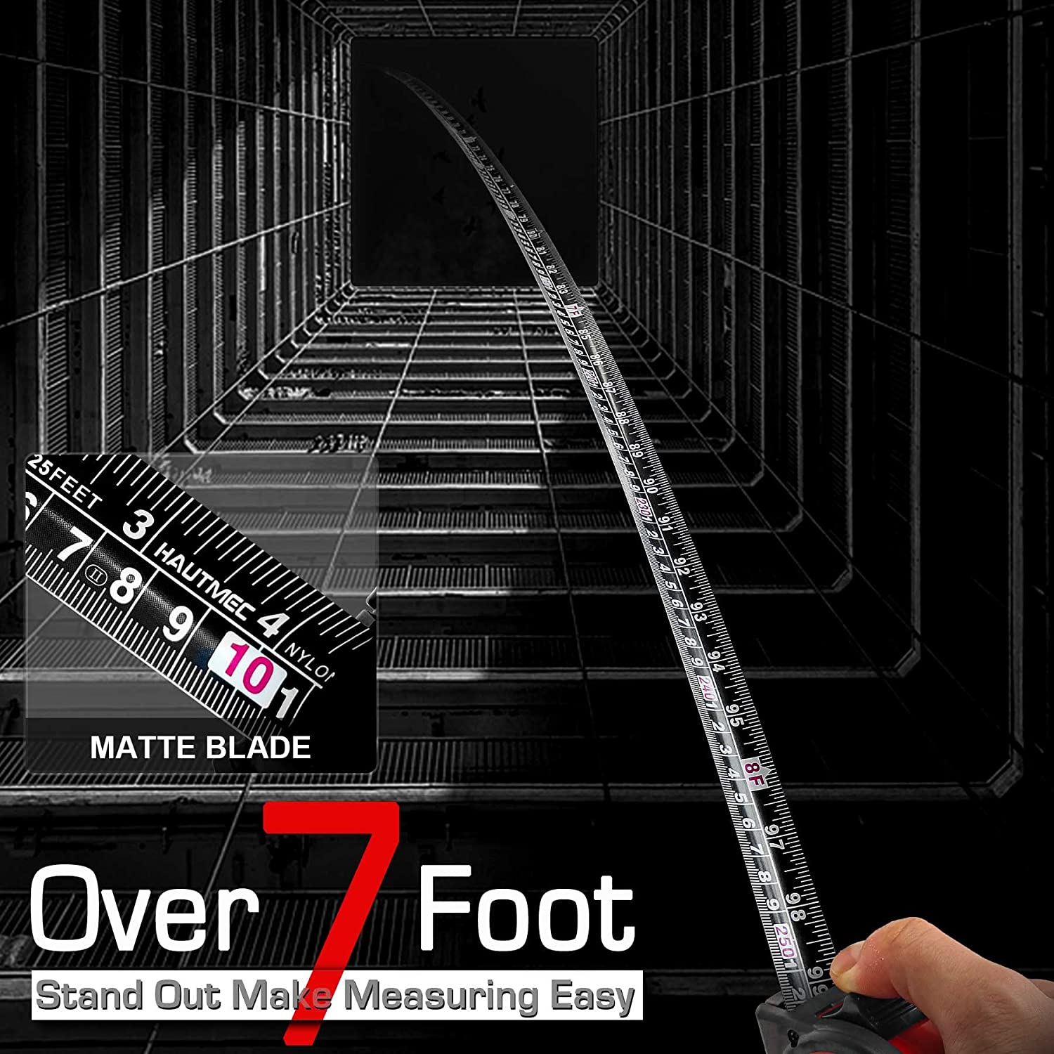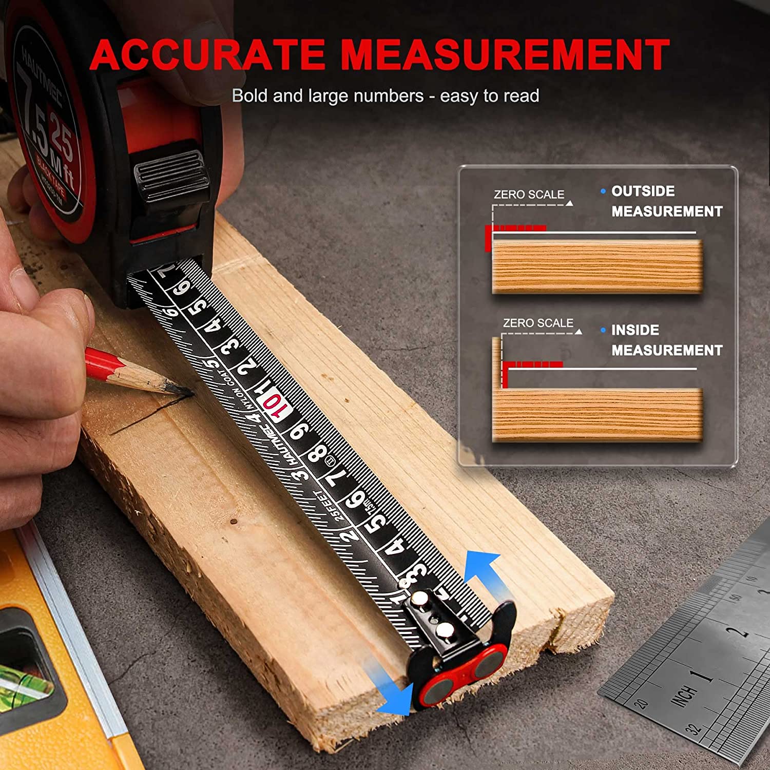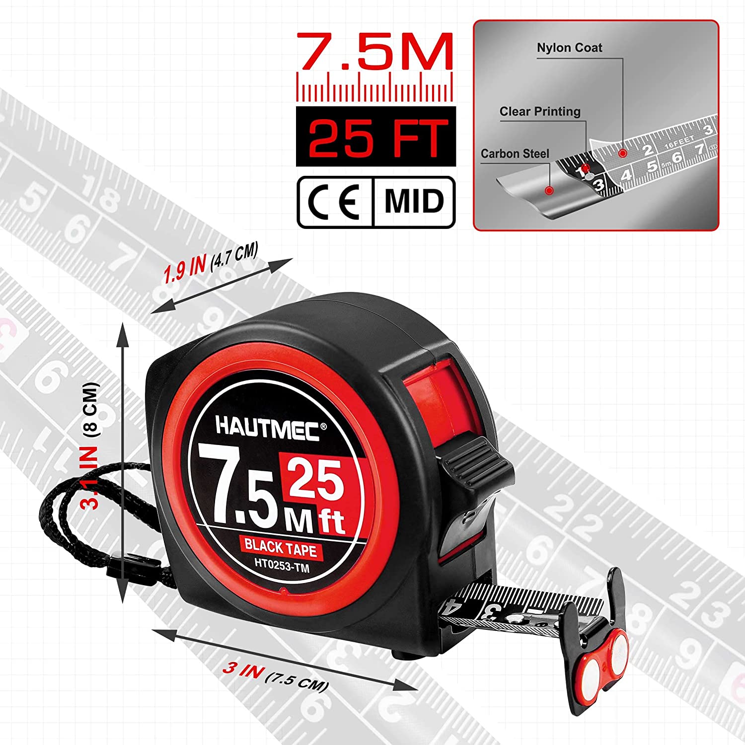 HAUTMEC Measuring Tape 25Ft-Double Side Metric and Inches Black Tape, Retractable Tape Measure with Double Stop Buttons,Magnetic Hook and Compact Case for Construction, Carpenter, Architect HT0253-TM