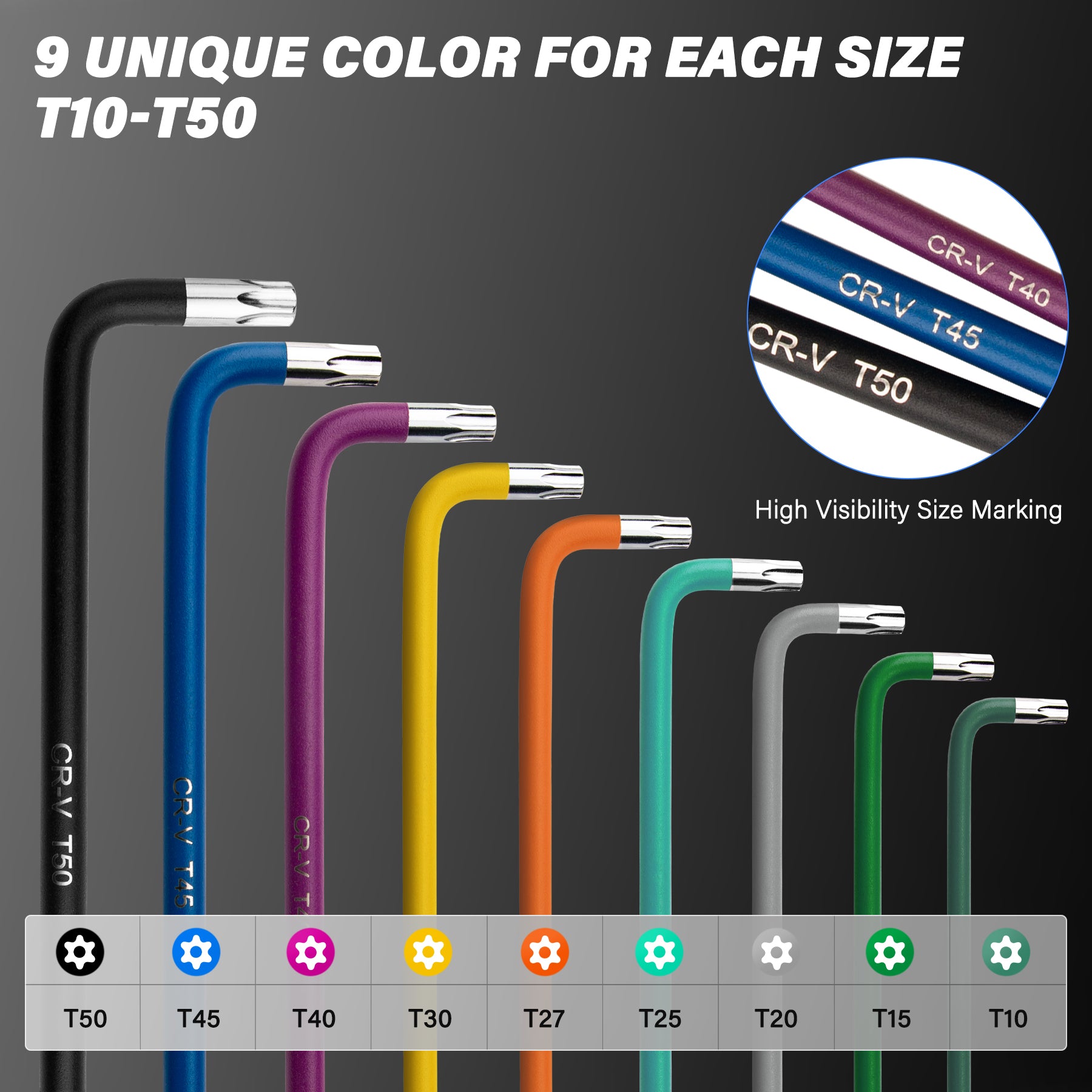 - [Complete Range Of Essential Sizes]: This 9-piece torx screwdriver set (T10, T15, T20, T25, T27, T30, T40, T45, T50) covers the most common sizes for a wide range of tasks. It effortlessly handles everything from delicate electronics and eyeglasses to furniture assembly, bicycle maintenance, and tough car interior repairs.