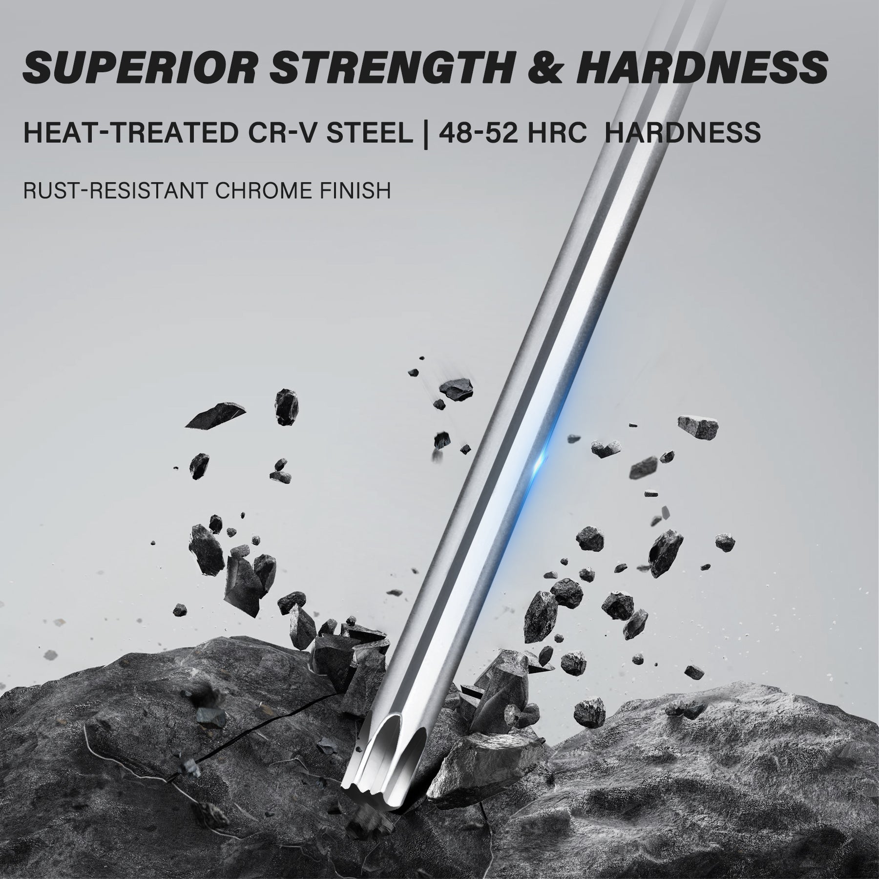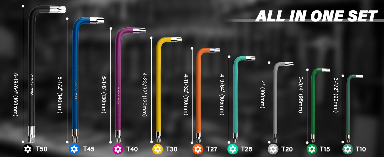 - [Durability & Non-Slip Grip]: Star allen wrench set forged from premium Chromium Vanadium Steel and hardened to 48-52 HRC, these torx wrench resist wear and stripping. Combined with the textured, non-slip grip, they ensure secure control and minimize hand fatigue, providing confidence and comfort during prolonged use.