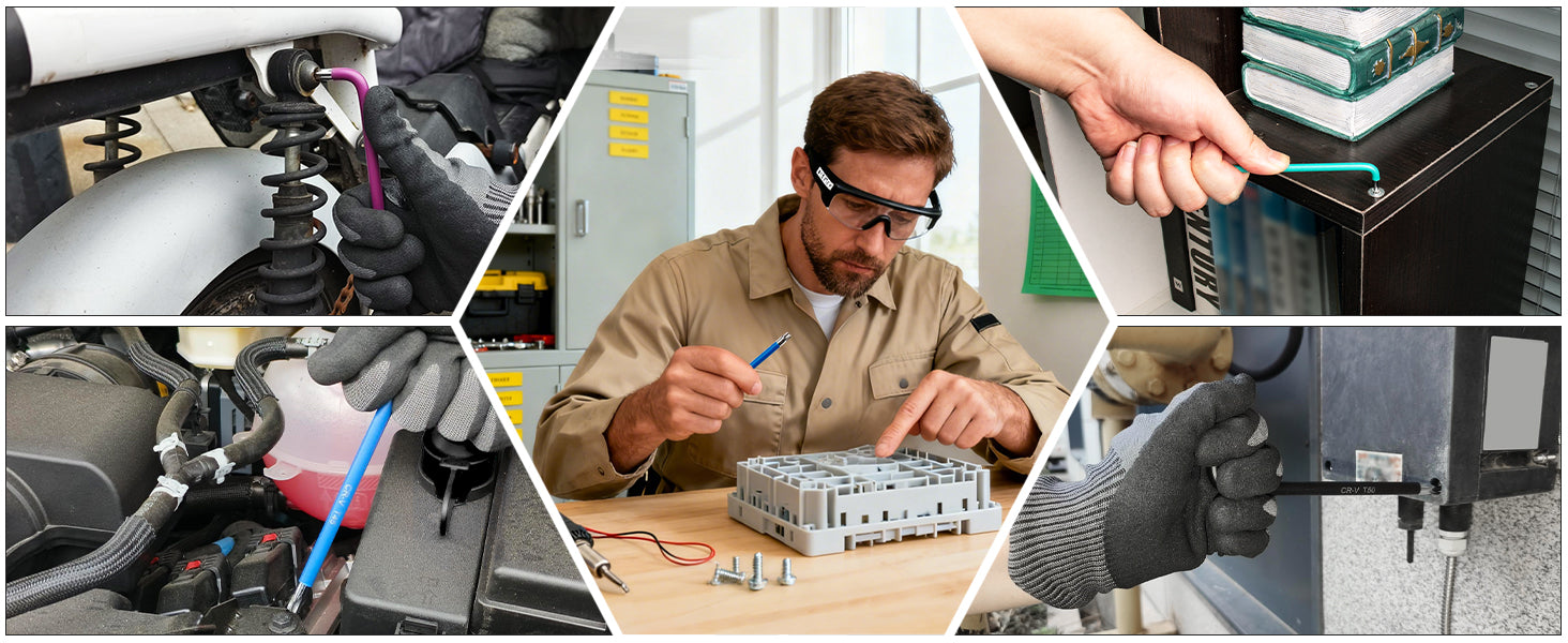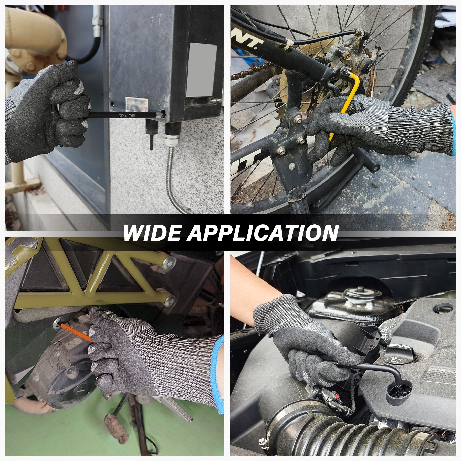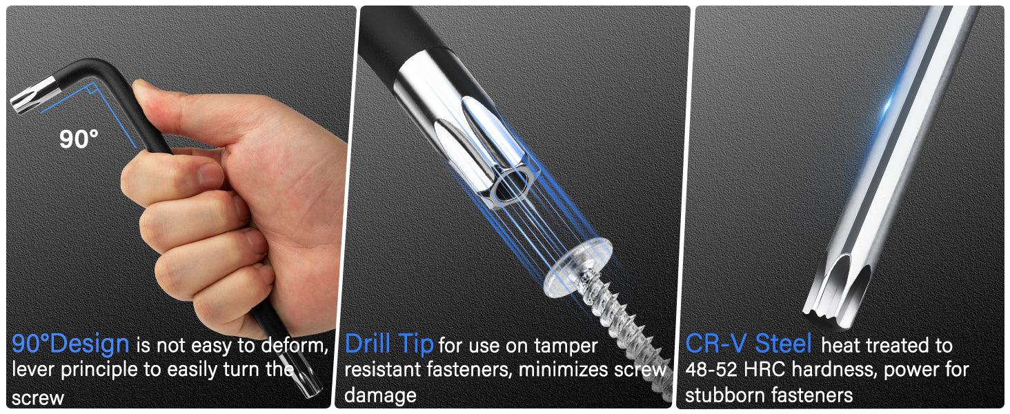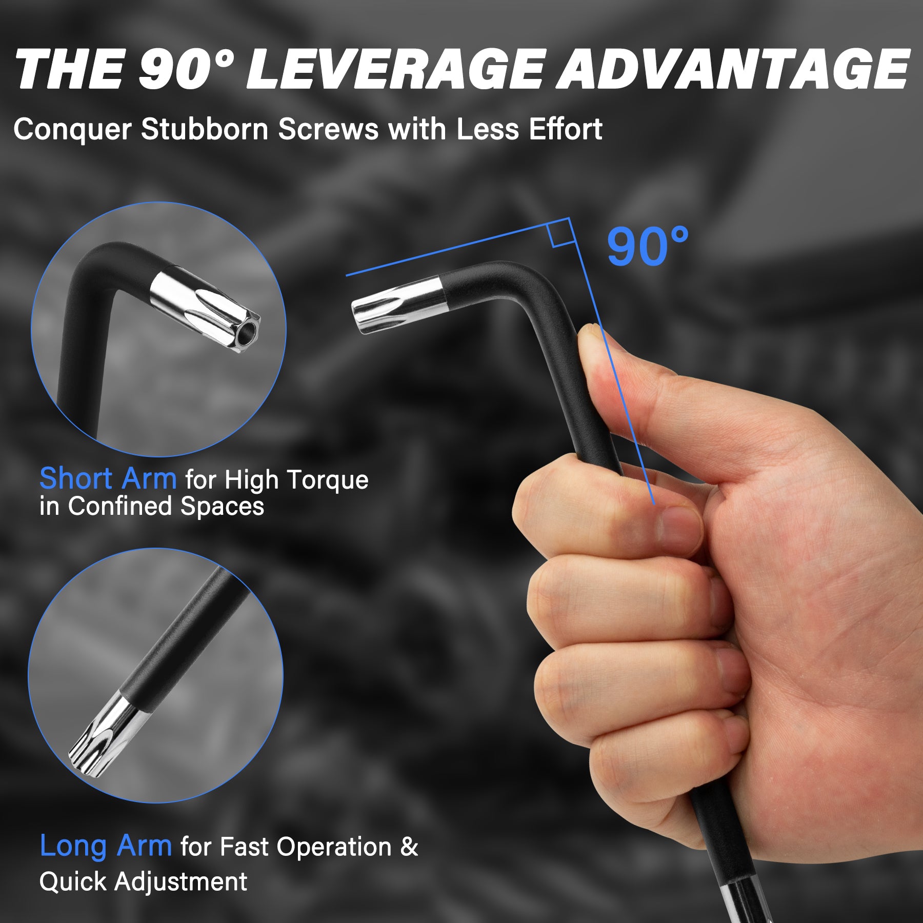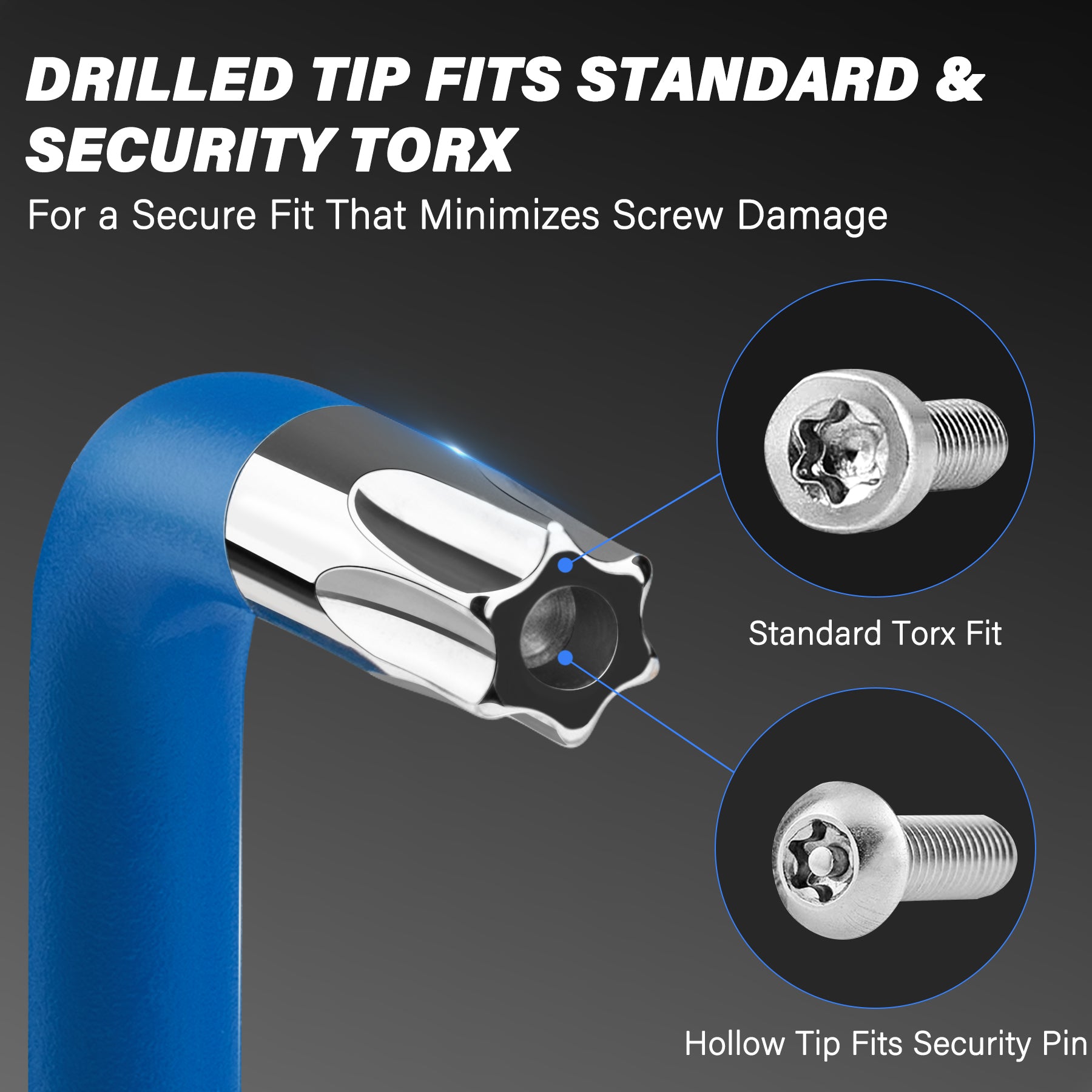 - [Optimized Leverage & Security Torx]: The L-shaped design provides superior mechanical advantage to tackle stubborn fasteners with less effort. Use the long arm star key set for greater turning power, or the short arm for increased torque in confined spaces. The drilled hollow tip (Security Torx) fits over the pin in tamper-resistant fasteners, allowing access to secured electronics, appliances, and public fixtures. This superior fit and hardened construction work together to minimize screw damage and ensure a long service life.
