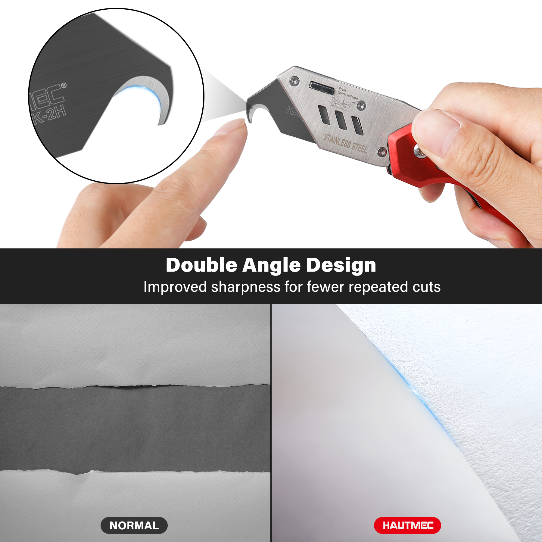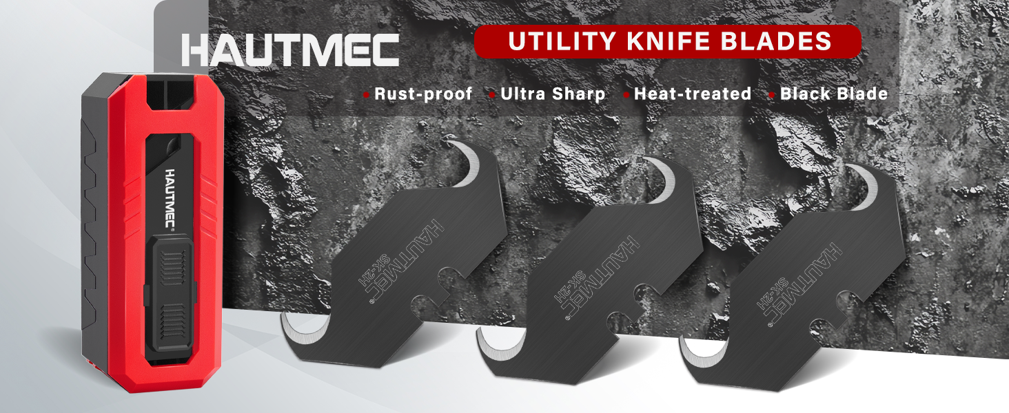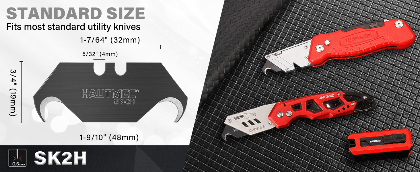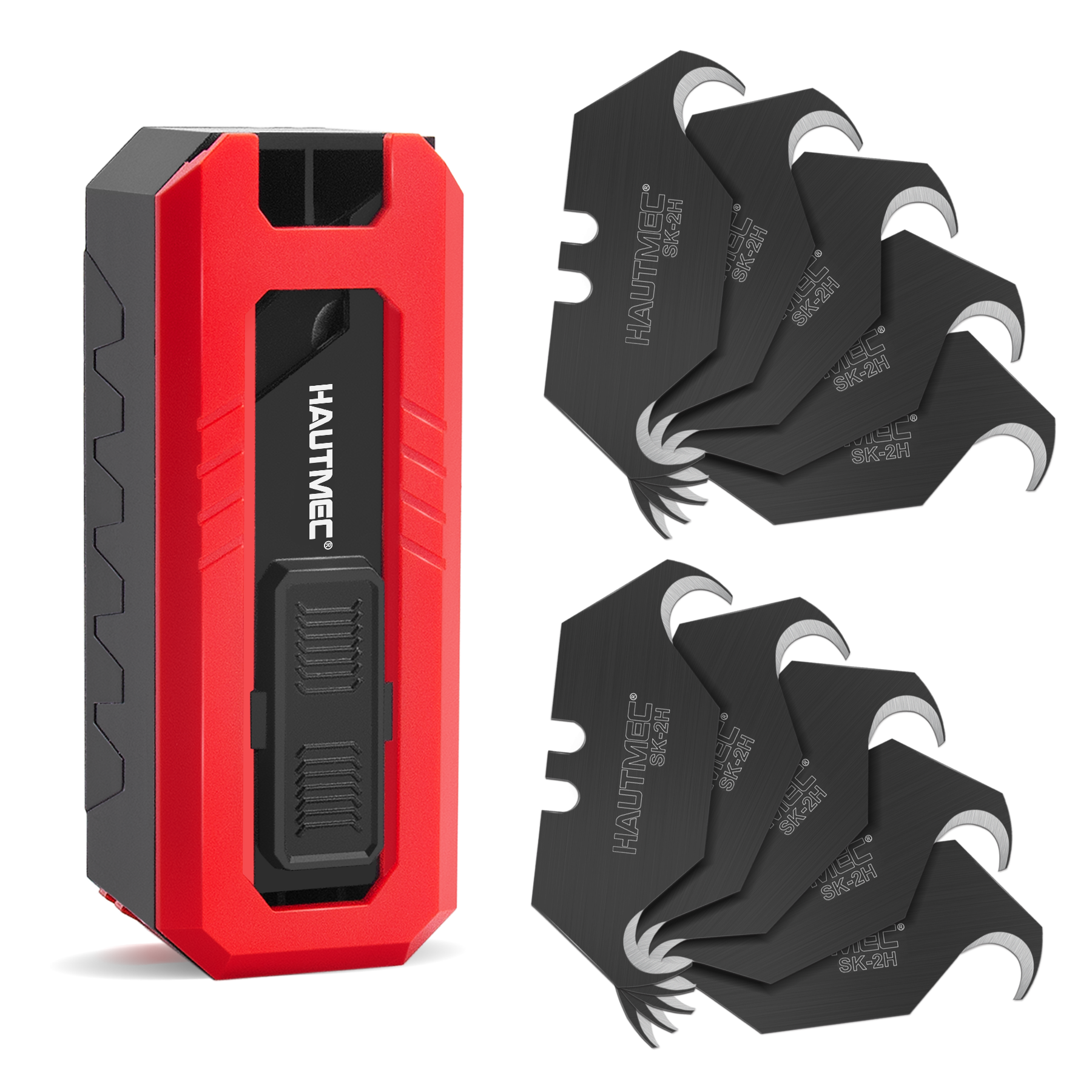 HAUTMEC Utility Knife Hook Blades, 10-Pack SK2H Steel Razor Blades with Innovative Safety Dispenser, Standard Size Replacement Blade for Heavy-duty Material Cutting – HTUBH25010