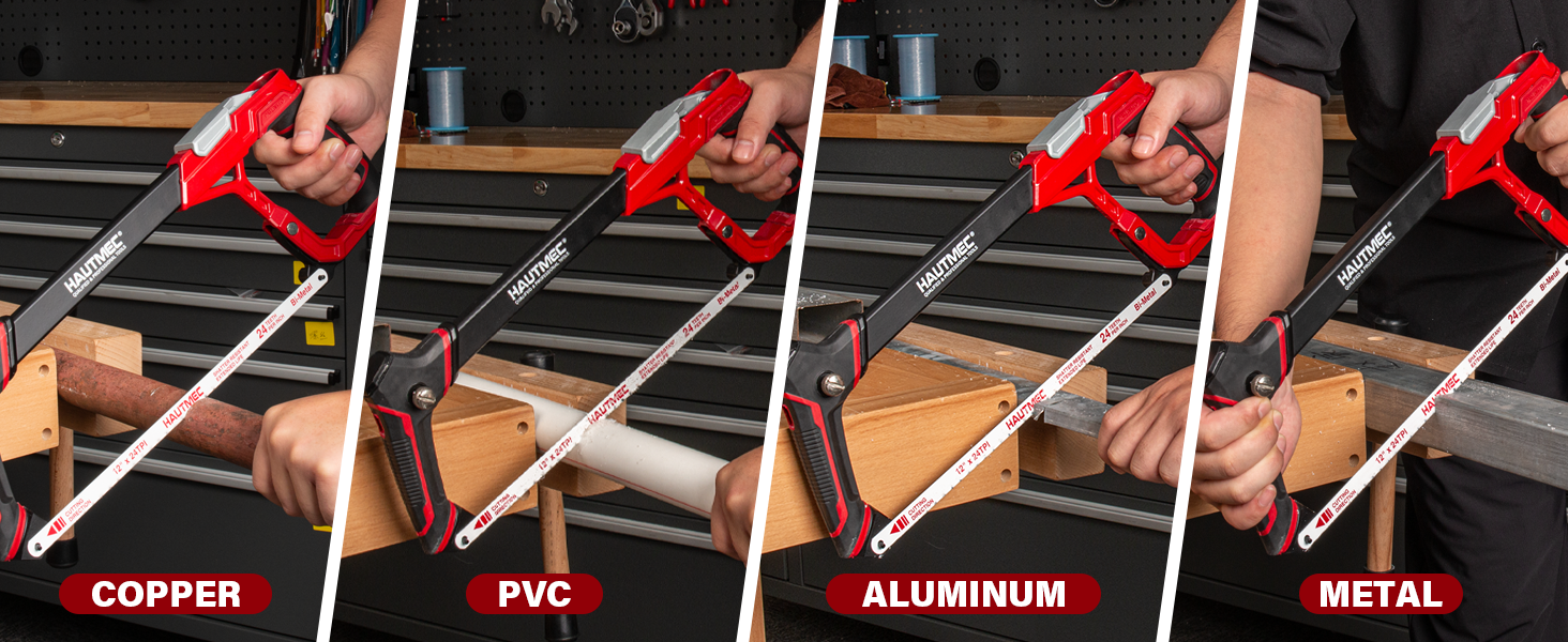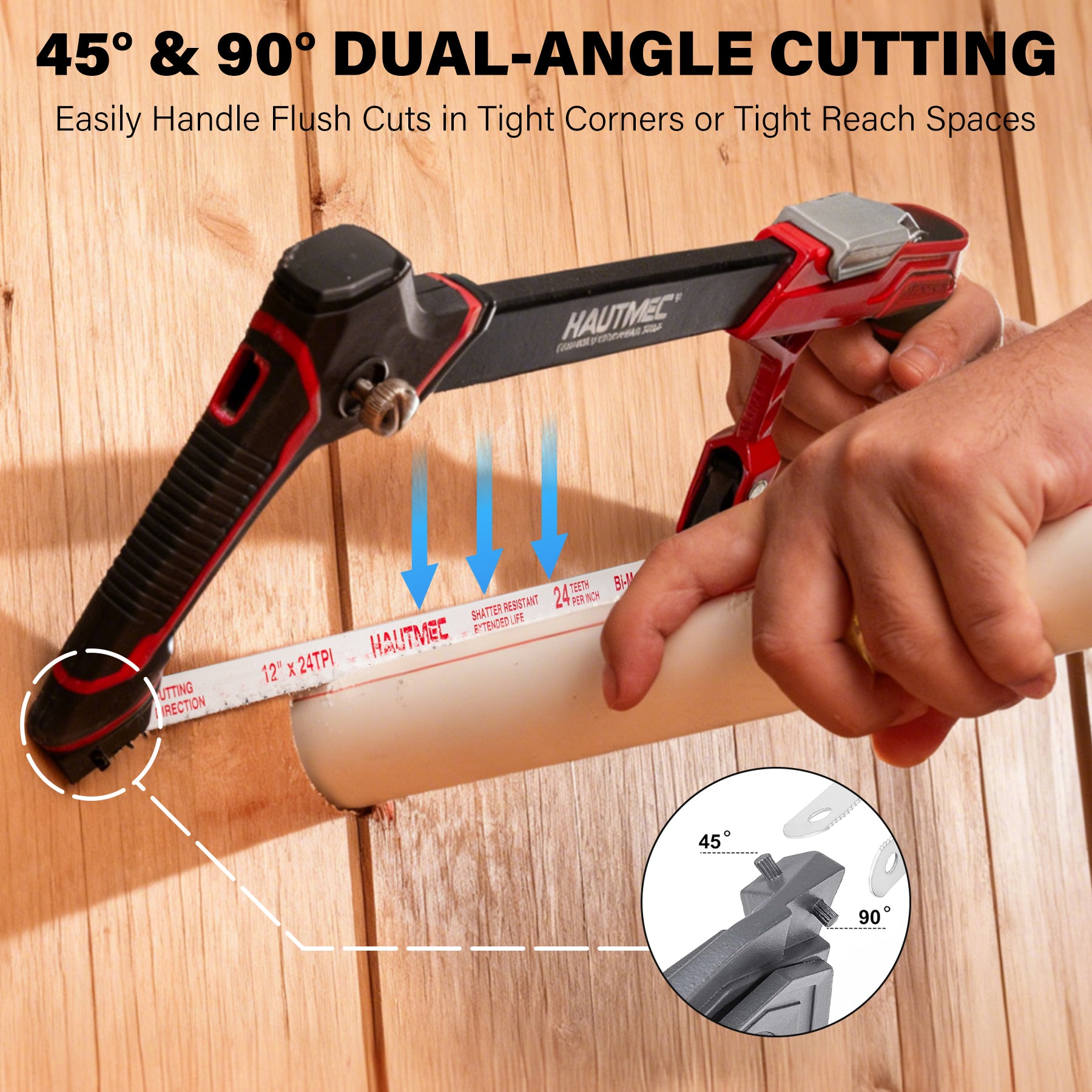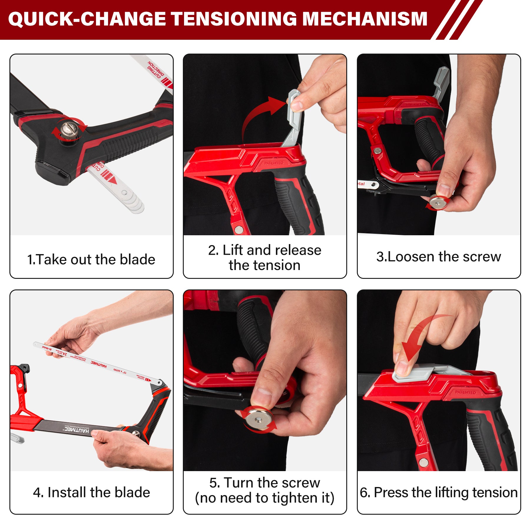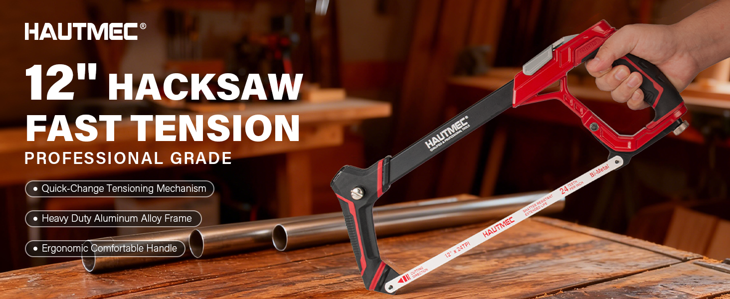 HAUTMEC 12" Fast Tension Hacksaw with Extra 5 HSS Blades, Heavy-Duty Aluminum Frame, Quick-Change Tension, Blade Storage, Pro Hack Saw with Dual Cutting Angles for Metal, PVC, Wood - HTHSH25034