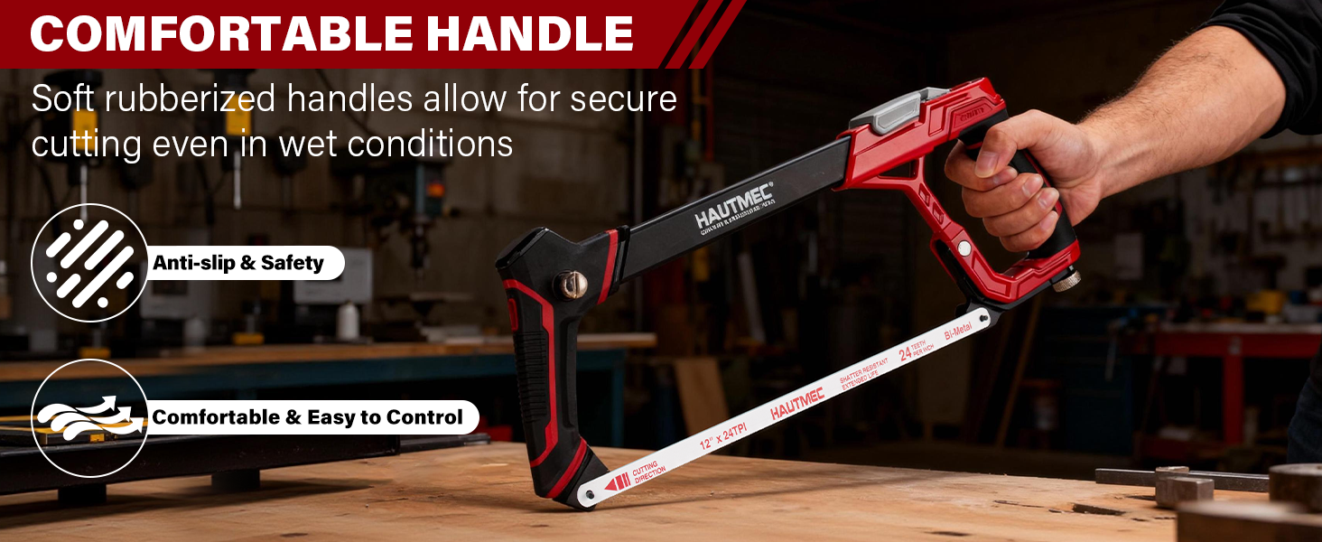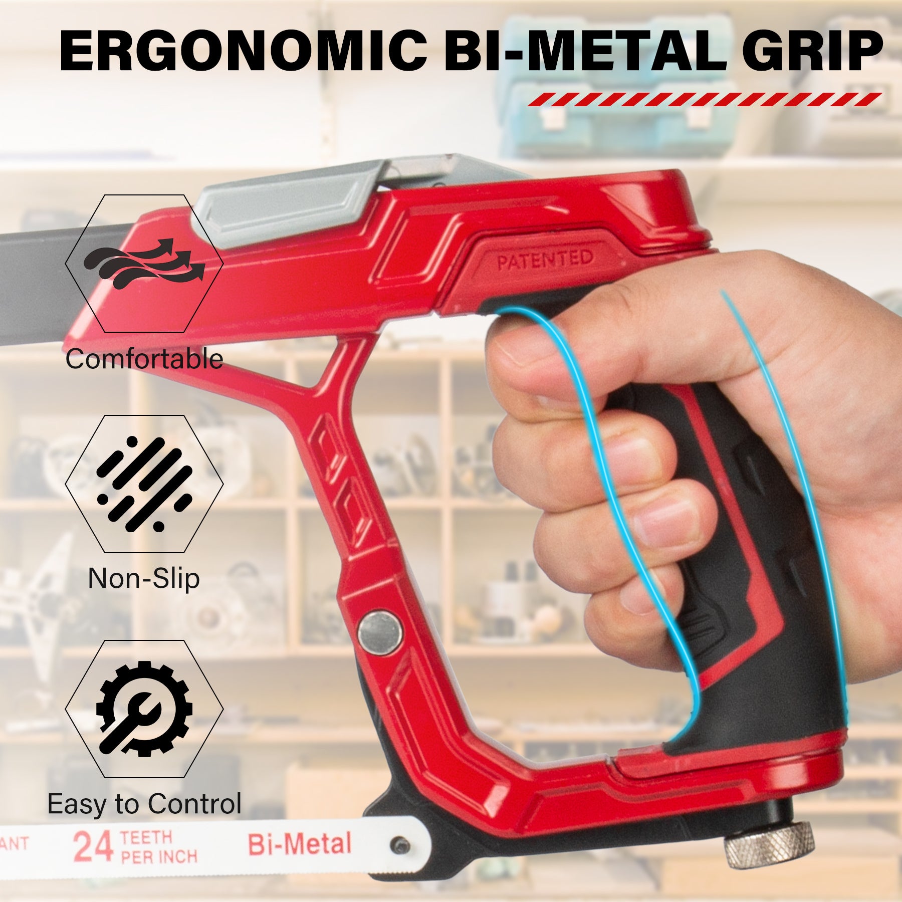 - 【Ergonomic Bi-metal Grip】Ergonomic with rubberized handles grip on the hacksaw allow for confident two-handed handling even in wet or cold environments, perfect for added control and firm when cutting thicker materials like metal or wood