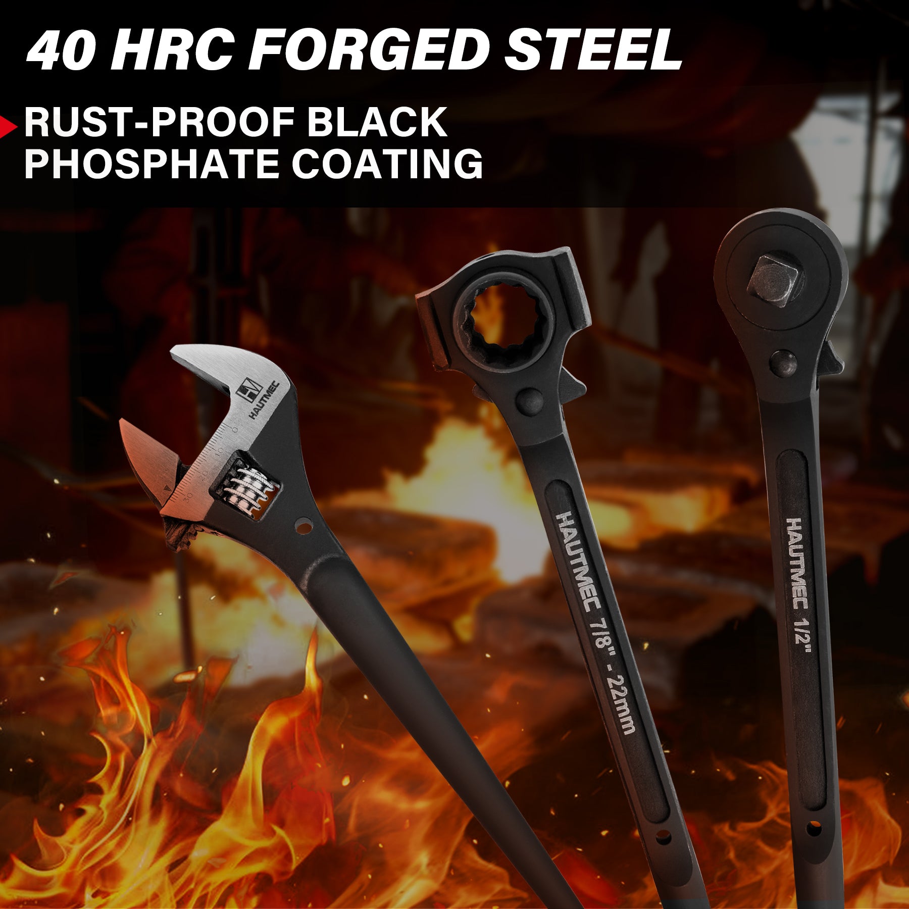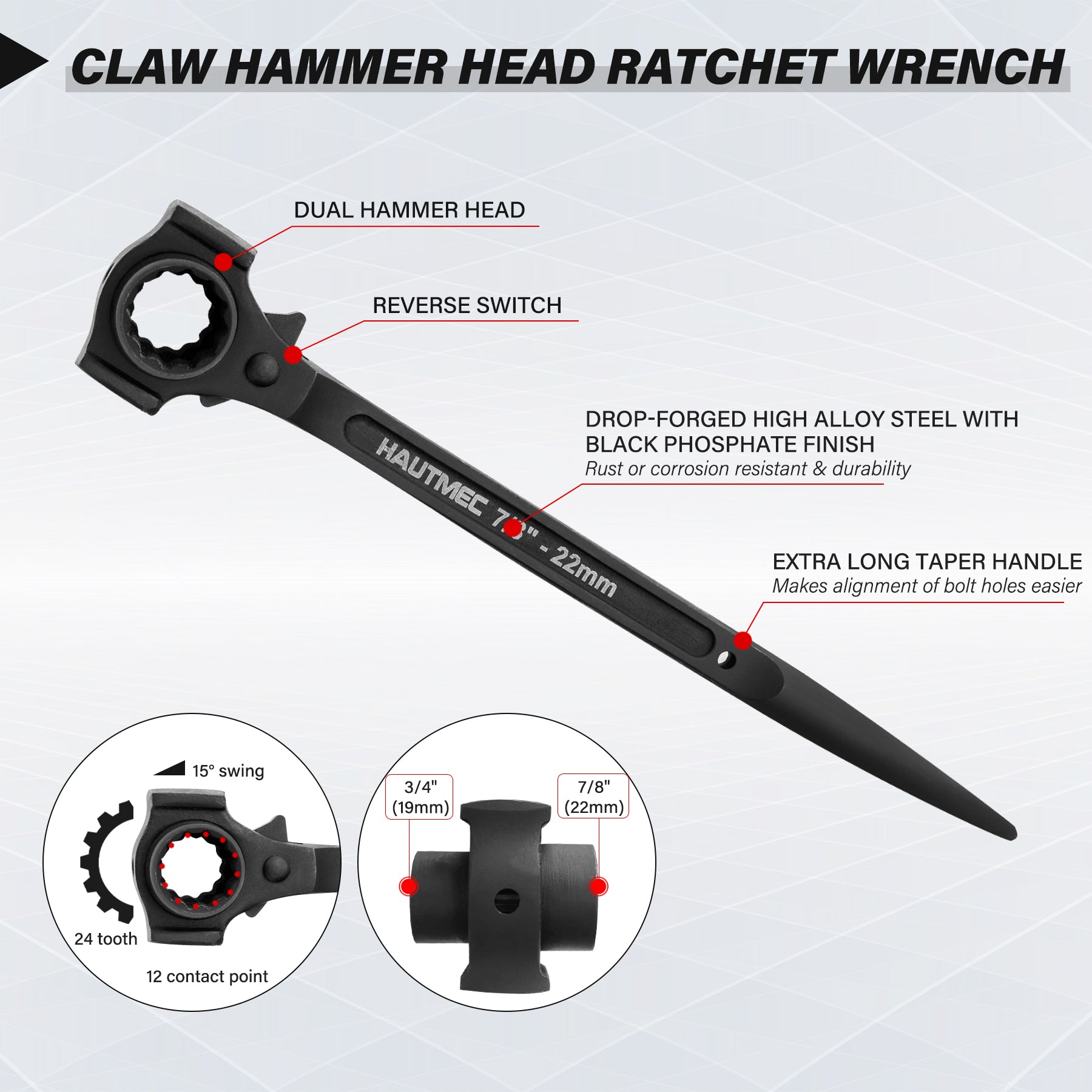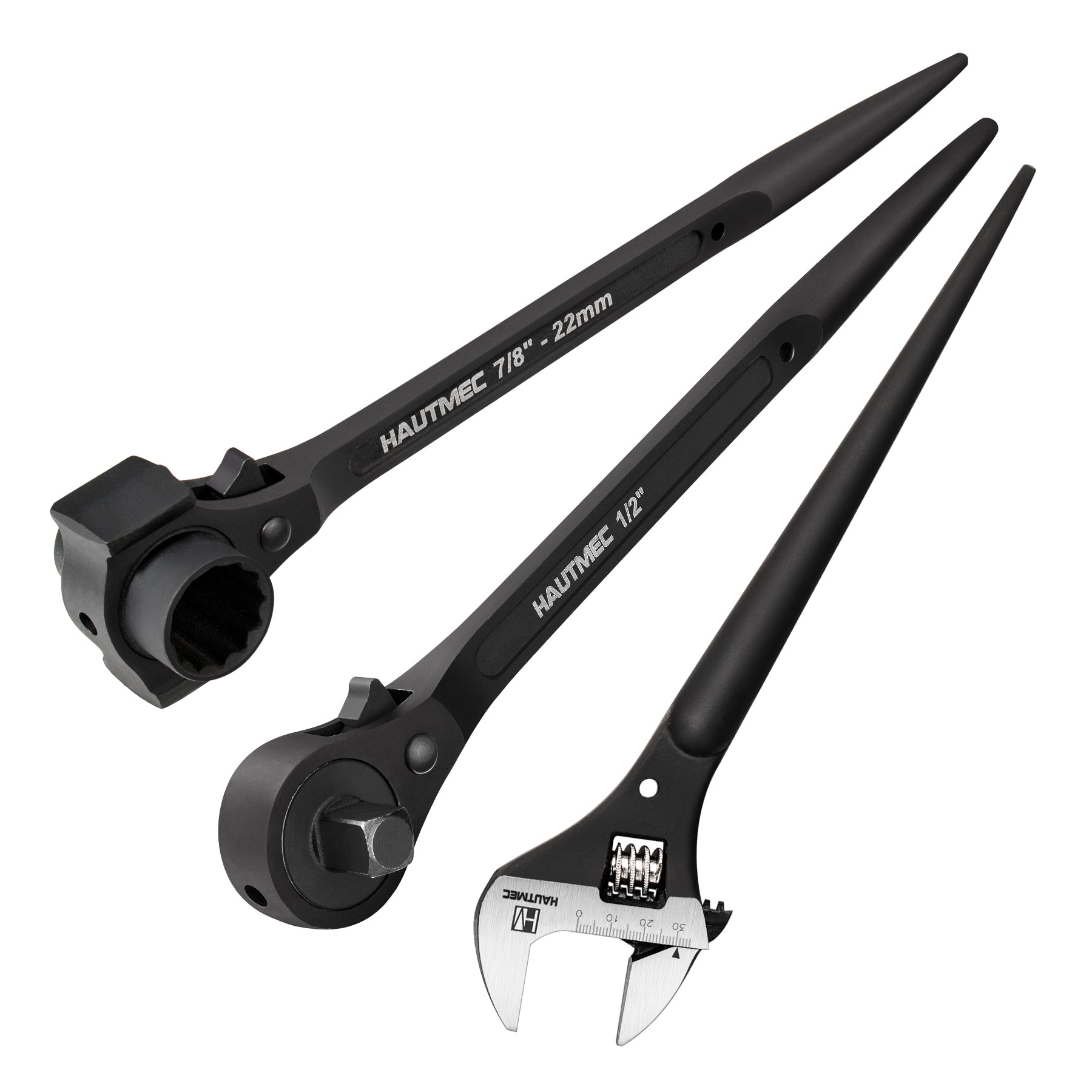HAUTMEC 12" Spud Ratchet Wrench Set(3 PCS), Includes 3/4" x 7/8" Dual Socket Scaffold Ratchet Wrench with Hammer Function, 3/8" x 1/2" Dual Head Ratchet, and Adjustable Spud Wrench HTASM25021