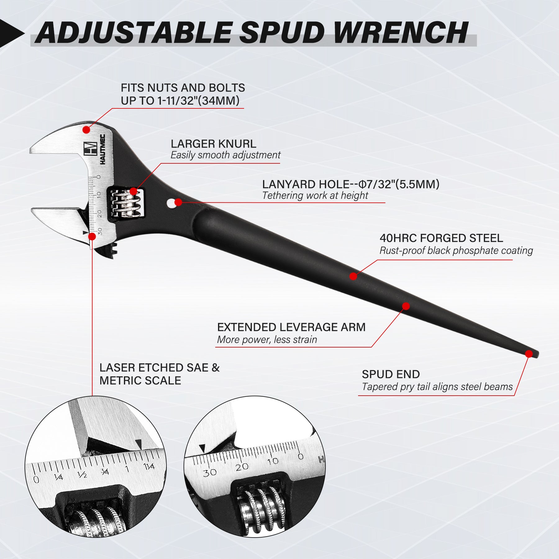- [4-IN-1 MULTITOOL]: 3 PCS spud wrench set covers 4 tasks with zero weak links. Includes a 12" adjustable spud wrench (alignment/prying), a 3/4" x 7/8" dual socket ratchet scaffold with hammer face(large nuts/demolition), a 3/8" x 1/2" dual head ratchet (small nuts/striking). Master steel erection, scaffolding & plumbing tasks.
