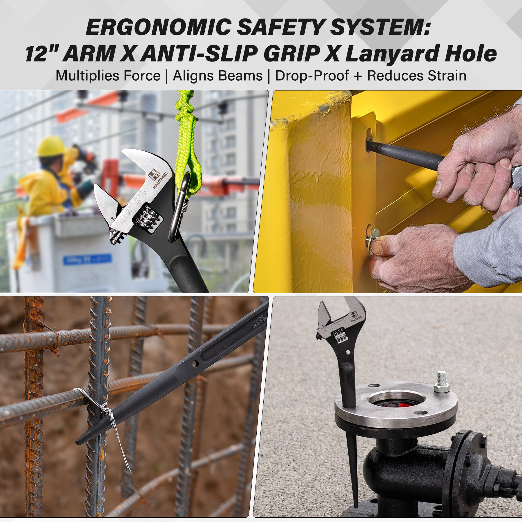 - [ERGONOMIC & SAFETY DESIGN]: 12" Leverage Arm + Anti-slip Grip + Lanyard Hole. Extended handle boosts leverage against frozen bolts, tapered pry tail aligns steel beams. Integrated lanyard port enables harness connection– prevents drops + reduced muscle strain.
