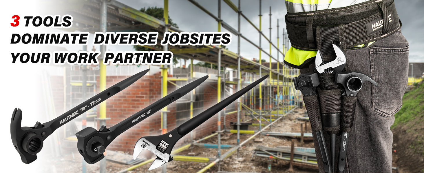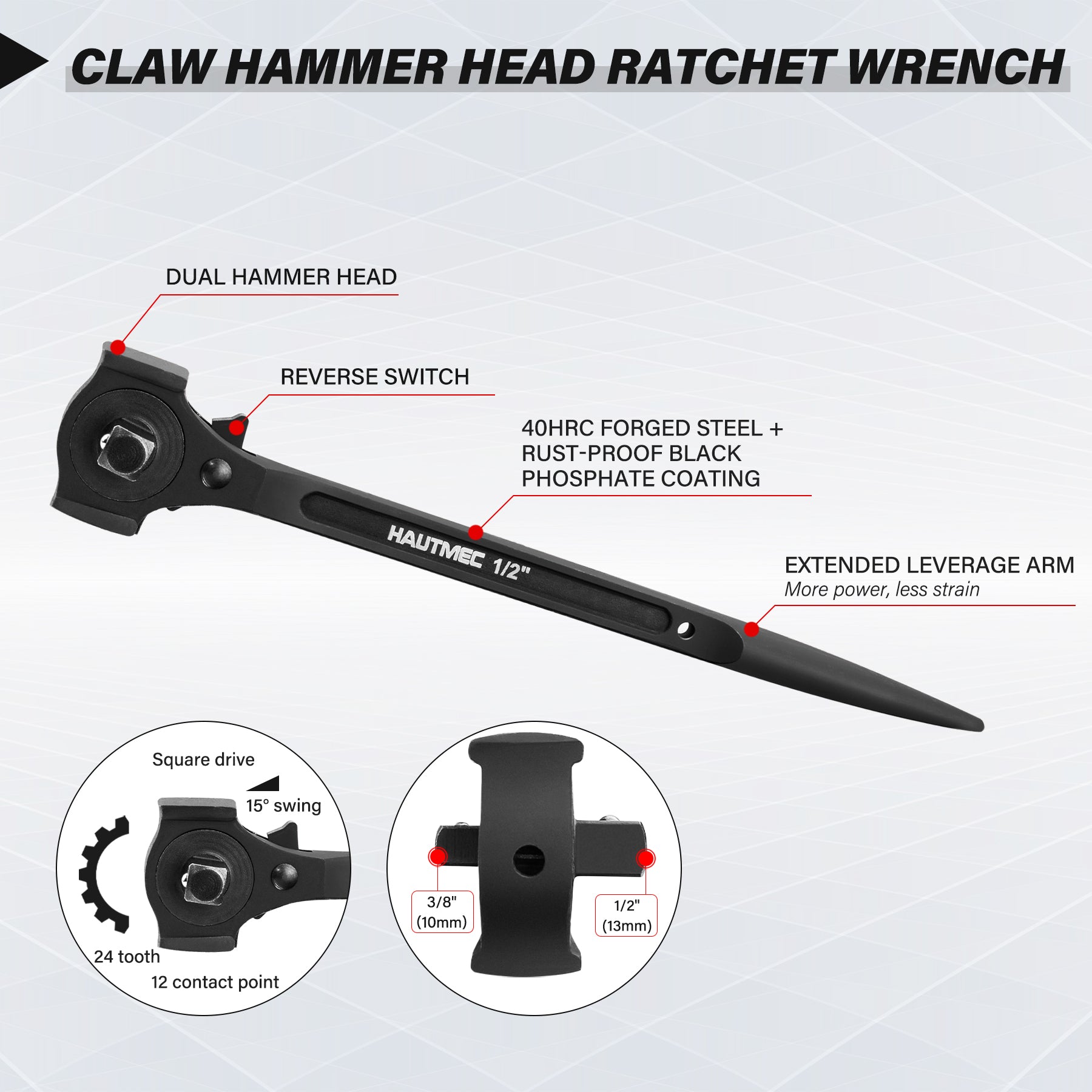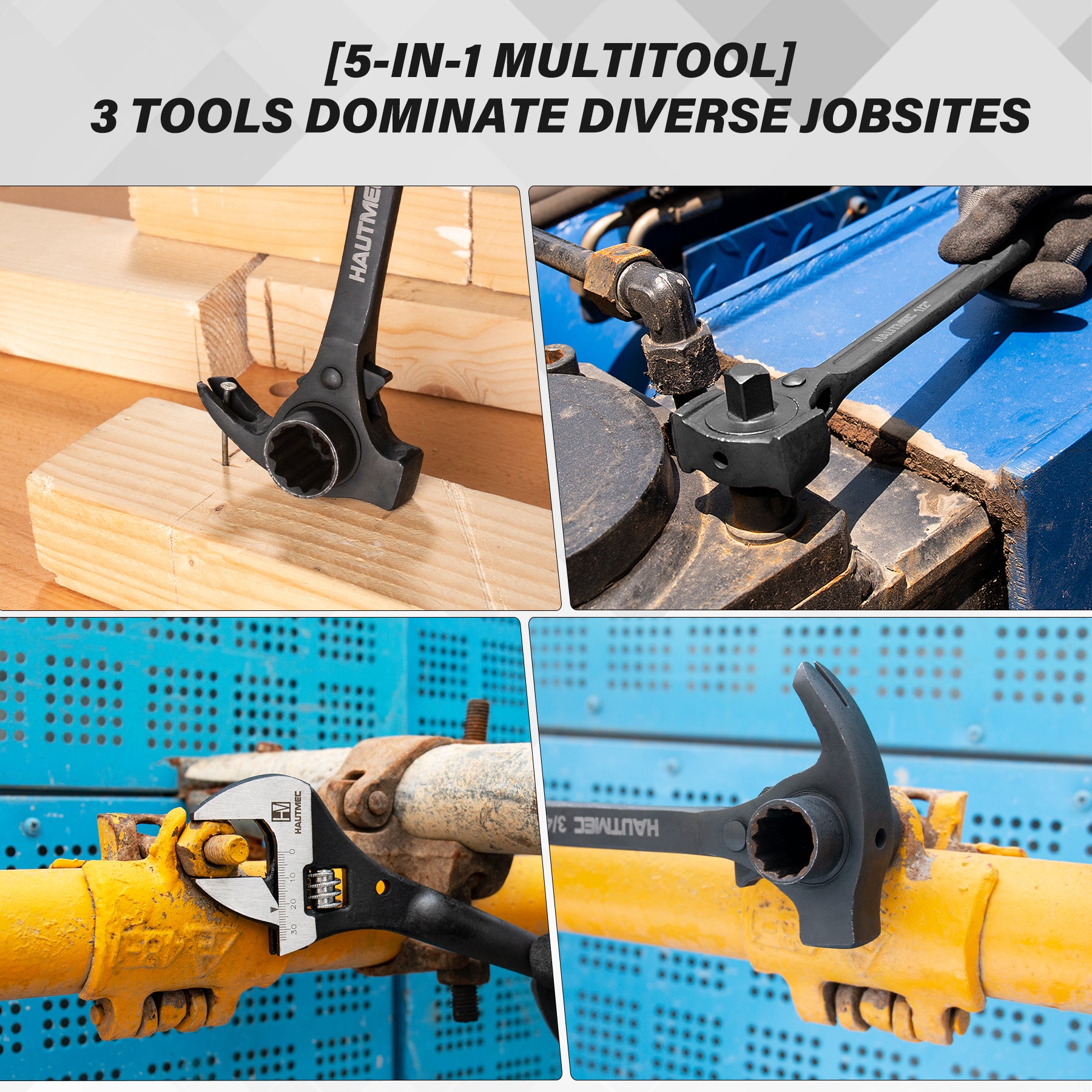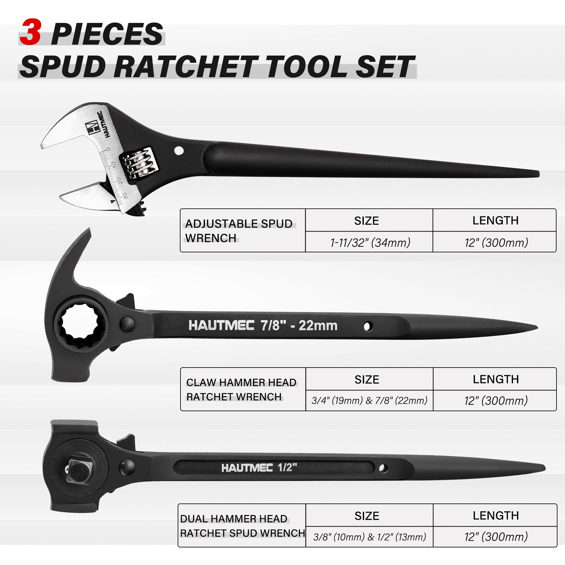 - [5-IN-1 MULTITOOL]: 3 PCS spud wrench set covers 5 tasks with zero weak links. Includes a 12" adjustable spud wrench (alignment/prying), a 3/4" x 7/8" dual socket ratchet scaffold with claw hammer (large nuts/demolition), a 3/8" x 1/2" dual head ratchet with hammer face(small nuts/striking). Master steel erection, scaffolding & plumbing tasks.